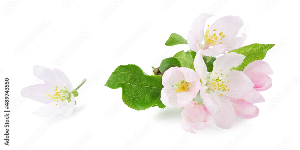 Apple tree flowers with leaves on a branch, isolated on a white background.