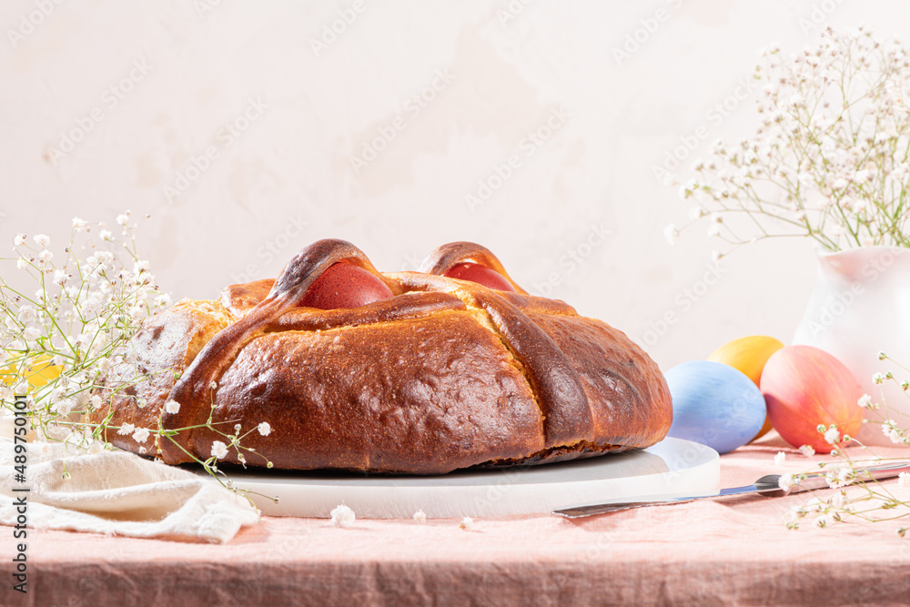 Portuguese traditional Easter cake. Folar with eggs on easter table. Blossom flowers and colorful painted eggs