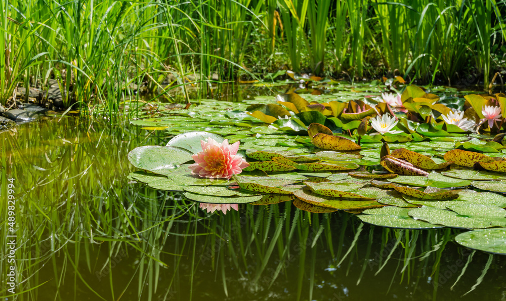 Magic big bright pink water lily or lotus flower Perry's Orange Sunset with water drops in pond. Nymphaea and green plants reflected in water.
