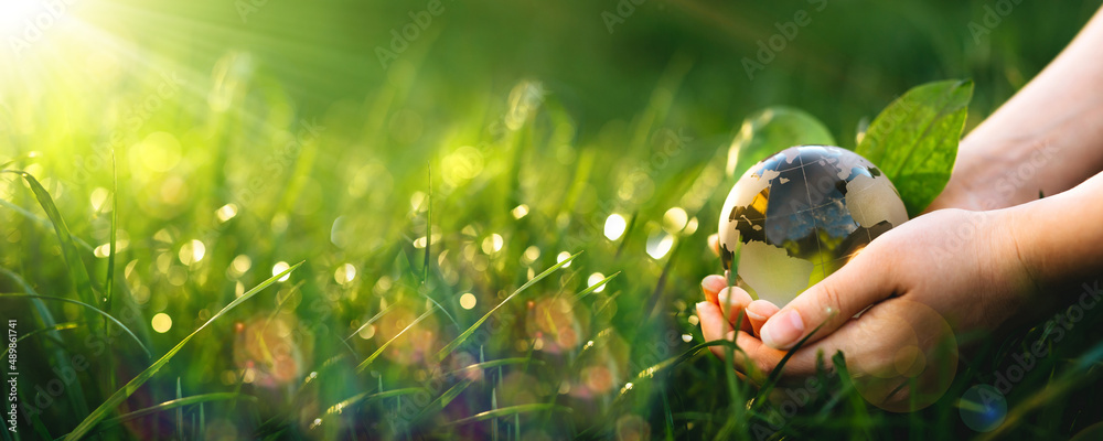 Earth Day.Hand holding crystal earth globe. Environment day, save clean planet, ecology concept.Renewable energy-based green businesses can limit climate change and global warming.