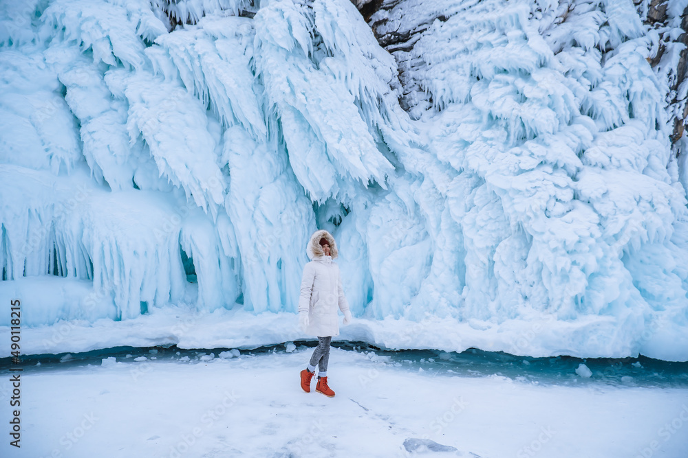 Slender girl traveler in winter clothes on the background of ice rocks. Nature of Lake Baikal in winter. Winter landscapes. White winter jacket, red boots. Blue ice.