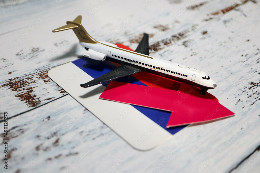 no travel by plane closed sky because of war conflict between Russian and Ukraine toy plane with russian and ukrainian flag