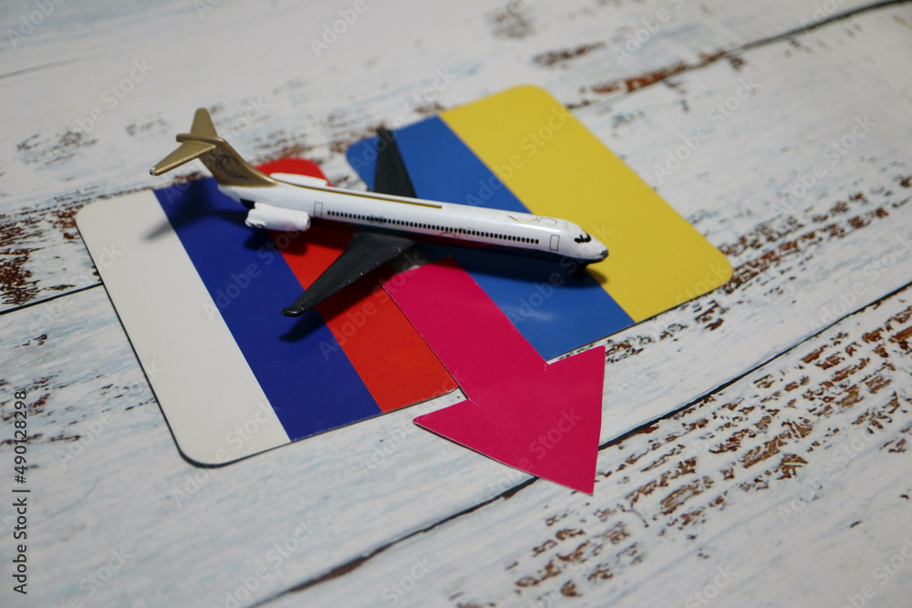 no travel by plane closed sky because of war conflict between Russian and Ukraine toy plane with russian and ukrainian flag