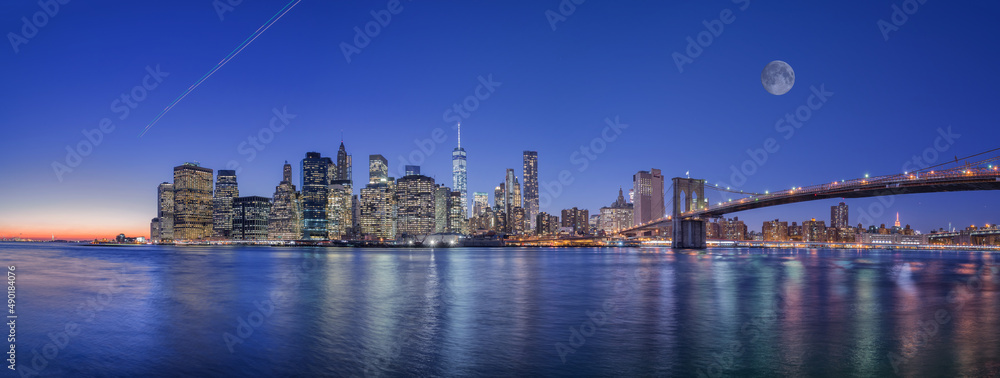 Mesmerizing view of Manhattan with lights reflections in the water under moon sky, New York City