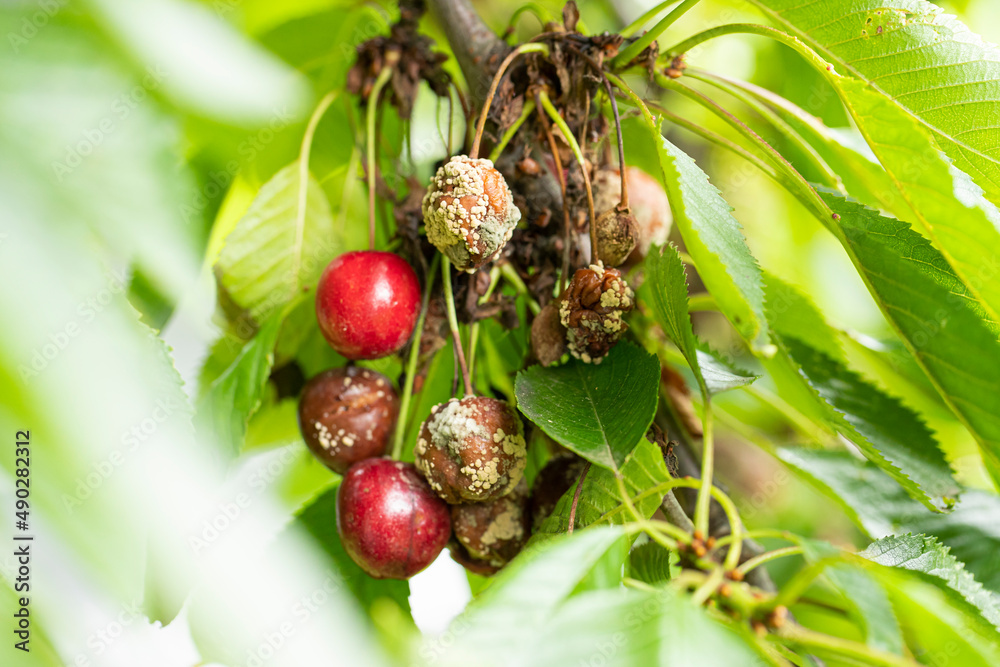Moldy rotten cherries due to excessive rain hanging in a cherry tree close up