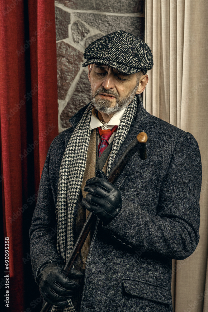 Mysterious retro 1920s english gangster with flat cap, grey coat and a fighting cane