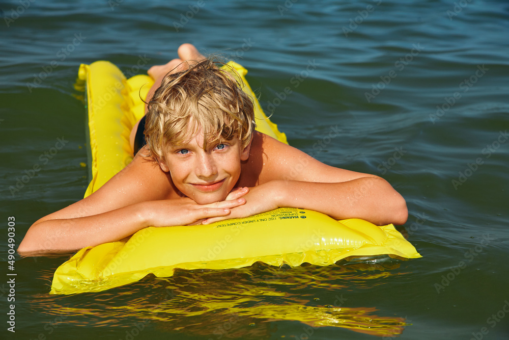 Teen boy swimming on air mattress in the sea and enjoying summer vacation