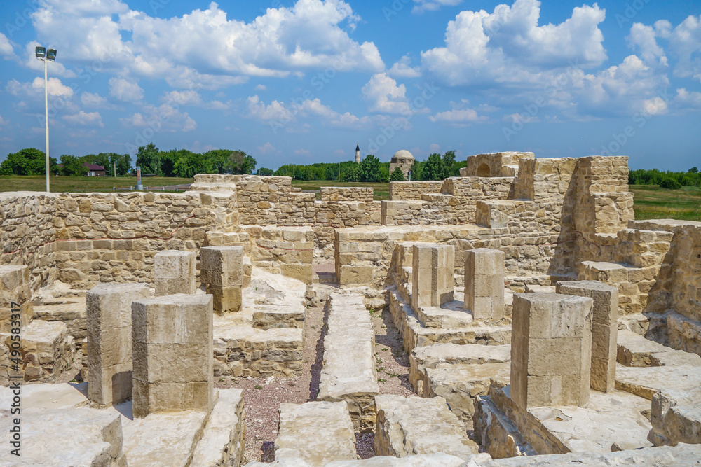 Remains of the White Chamber, a monument of Volga Bulgaria. Other monuments are visible in the distance. Shot in Bolgar, Russia