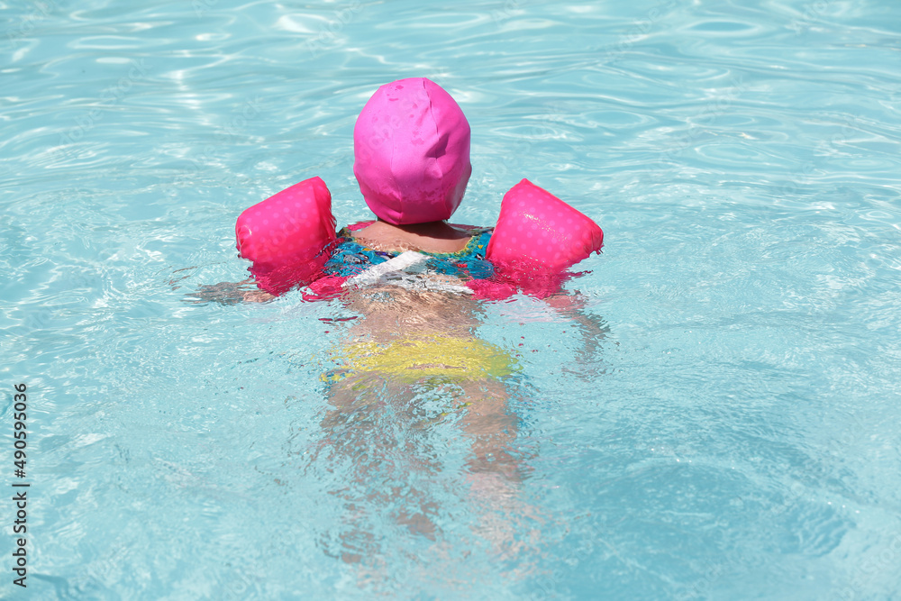 Criança na piscina a nadar com flutuador rosa com água azul.