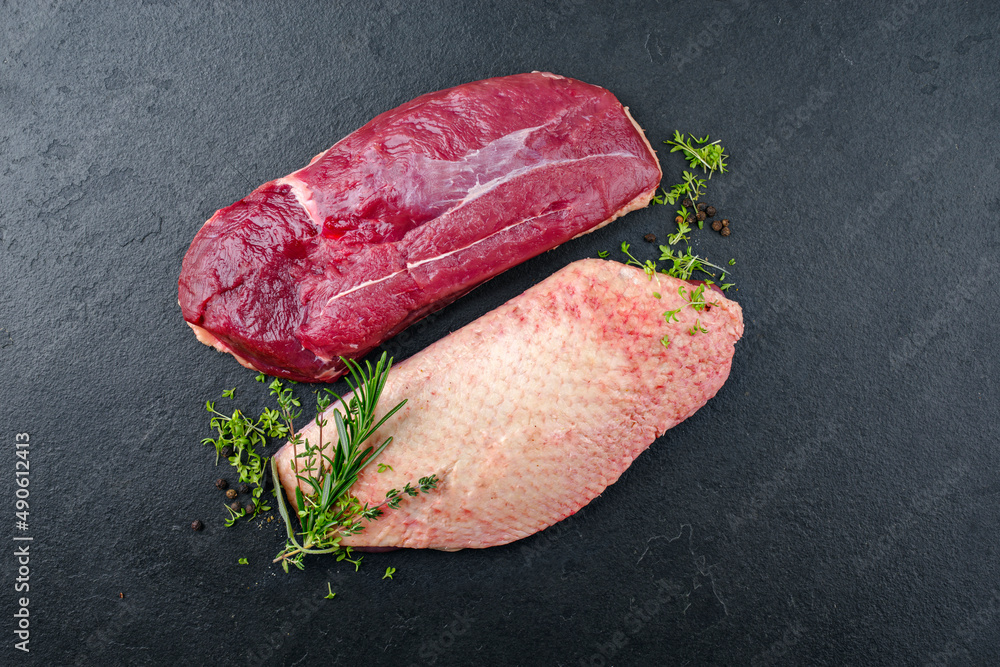 Traditionelles rohe Gourmet Entenbrust Filets mit Haut angeboten mit Kräutern und Pfeffer als Draufsicht auf einem schwarzen Board