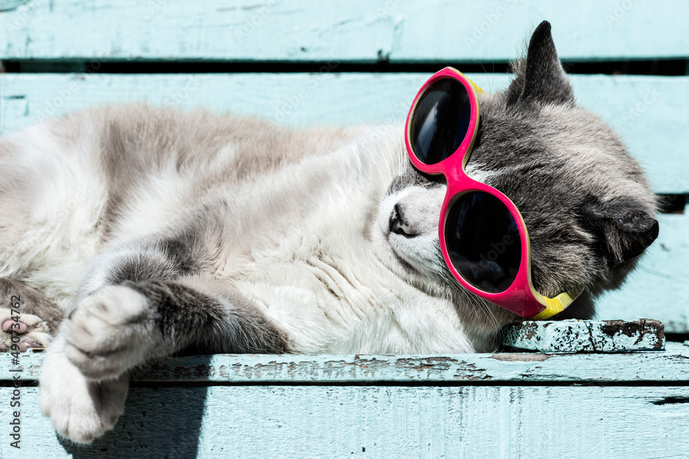 Domestic gray purebred feline cat getting up from sunbathing with glasses in spring. Cute kitten with whiskers on his muzzle relaxing in the sun