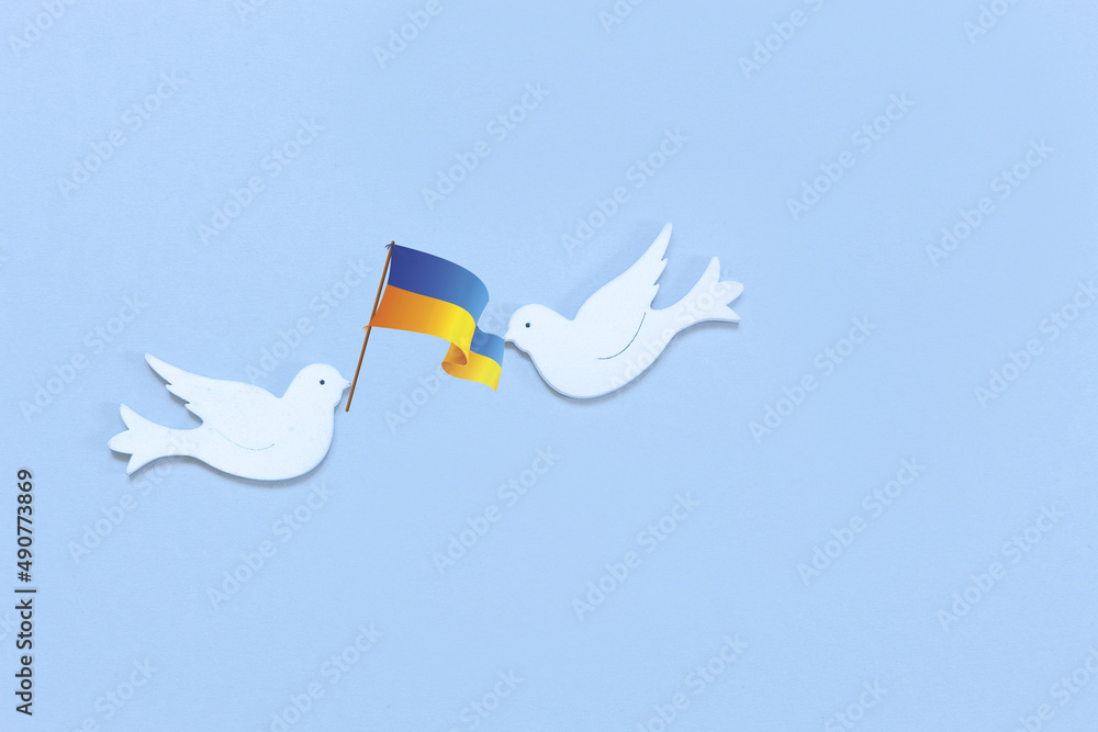 Two white figurines of a doves of peace with flag of Ukraine in their beaks on the light blue background. Peace Concept