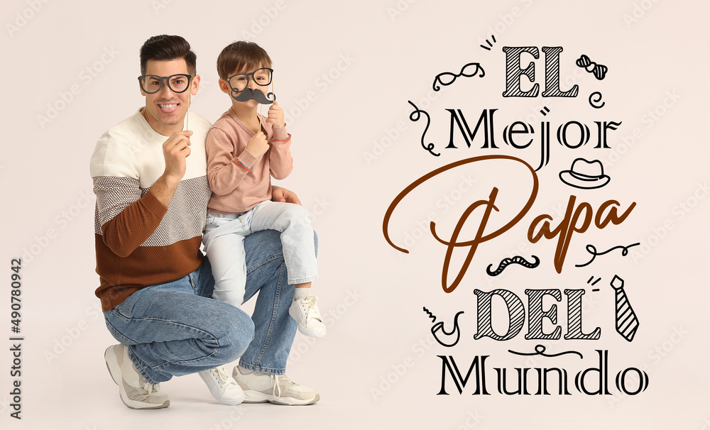 Greeting card for International Father's Day with daddy and son on light background