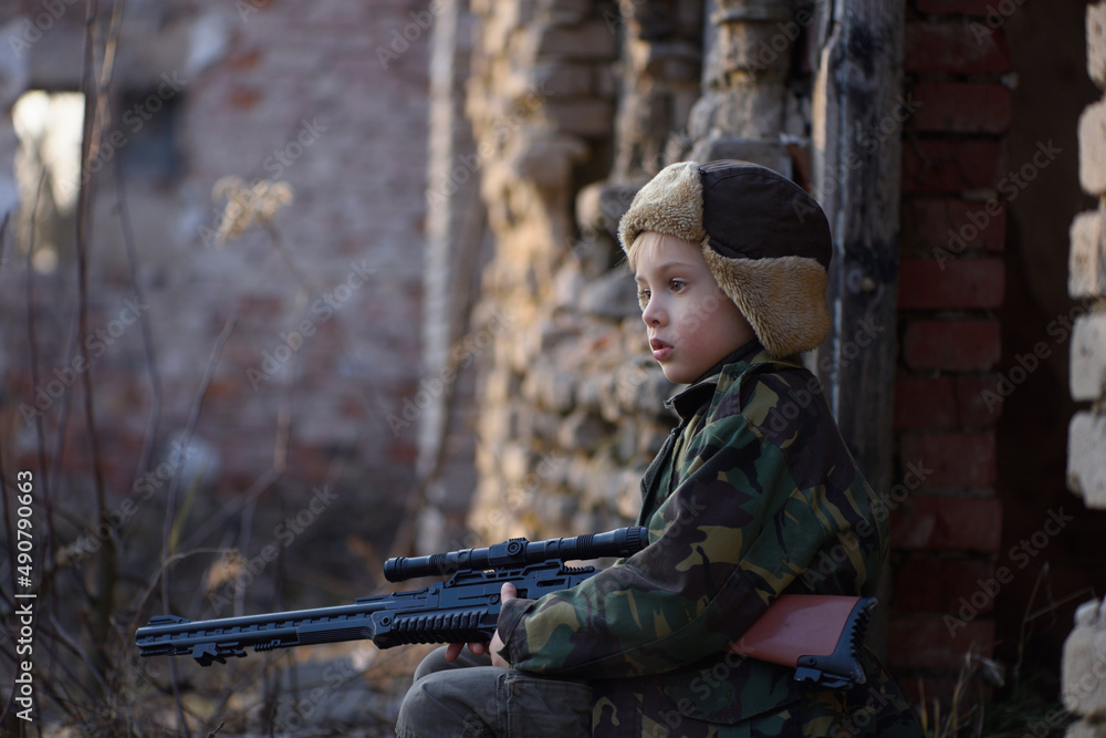 Child and war. Poor, homeless child in the ruins of a destroyed house.