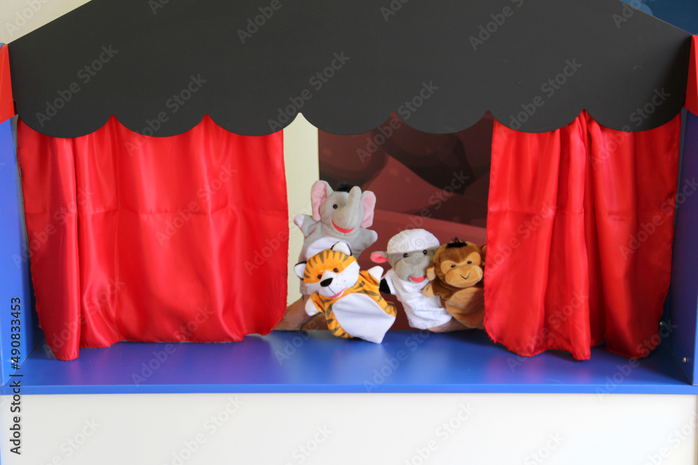 Guignol theater cultural and educational children's activity tells a story in a small replica of a theater with puppets or glove dolls moving their hands