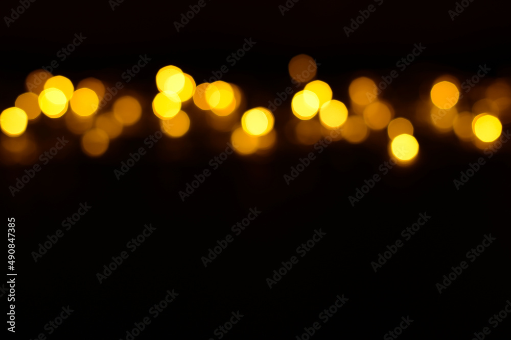 Golden glitter bokeh lights on black background, unfocused. Party time. Festive, birthday background, copy space