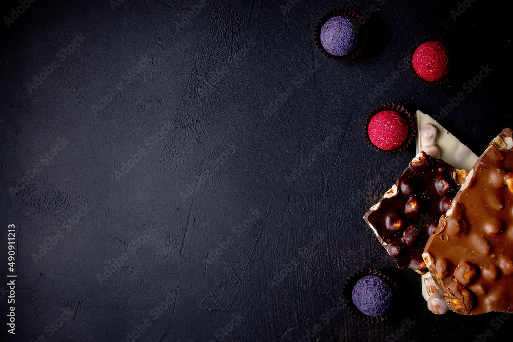 Chocolates background. Chocolate. Assortment of fine chocolates in white, dark, and milk chocolate. Praline Chocolate sweets