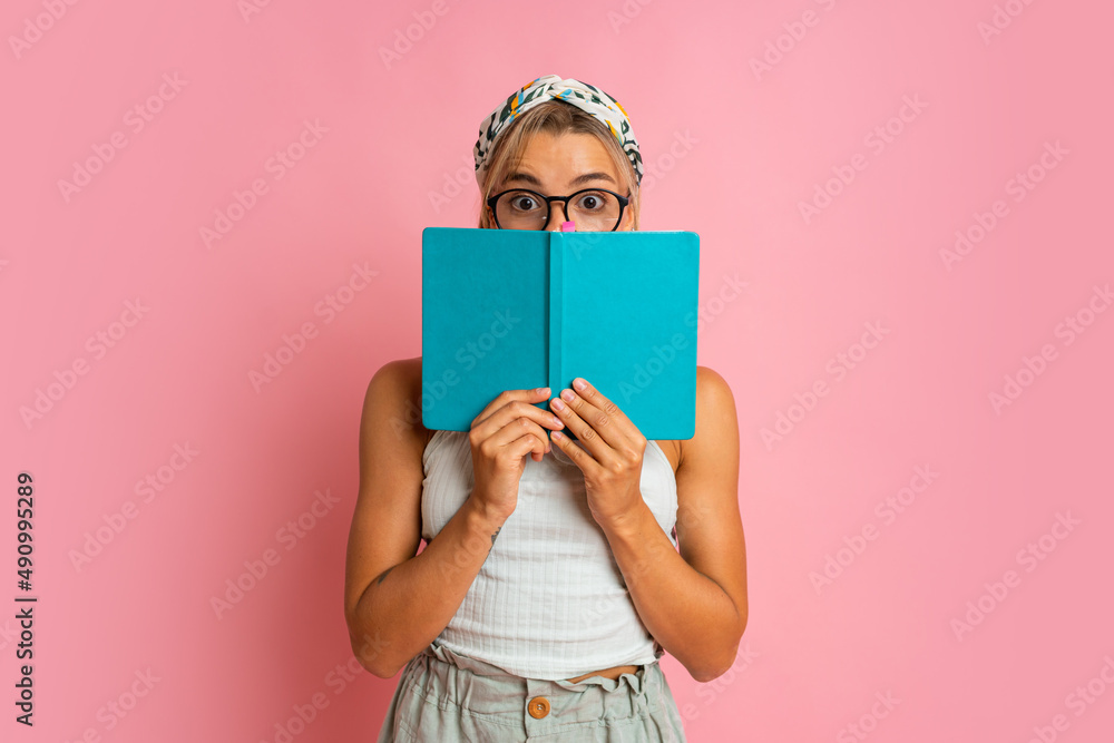 Studio photo of pretty blond student woman with suprice face posing with note book on pink background.