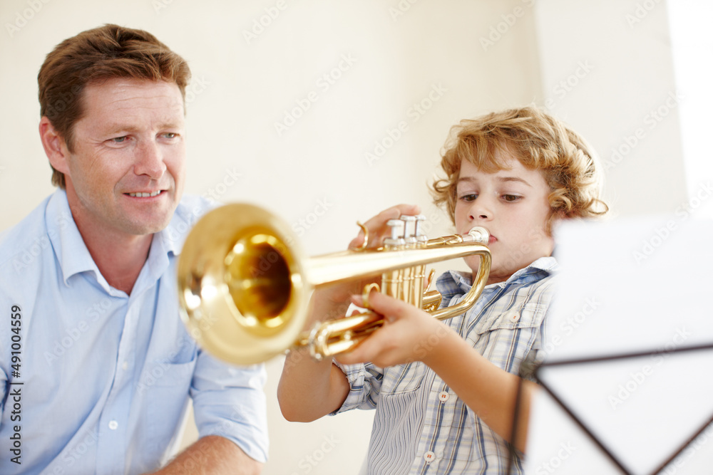 Proud of his little trumpet player. Shot of a cute little boy playing the trumpet while his father watches him proudly.