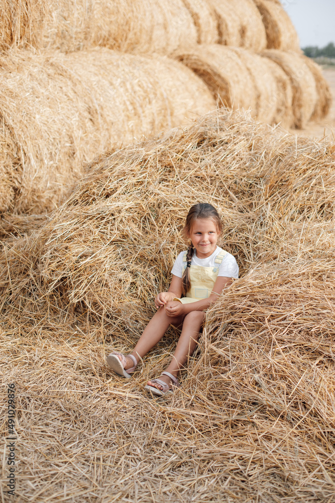 Nice young girl sitting in heap of scattered hay smiling with sly thinking eyes looking away and holding hay in hand wearing sundress. Having fun away from city on field full of golden hay.