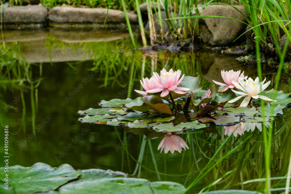 Magic bright pink water lily or lotus flower Marliacea Rosea in the garden pond. Nympheas reflected in water. Flower landscape for nature wallpaper