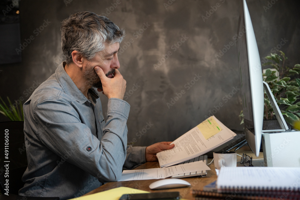 homme, employé de bureau ou homme d'affaire qui travaille à la maison avec son ordinateur. il est concentré et soucieux. Il fait du télétravail.