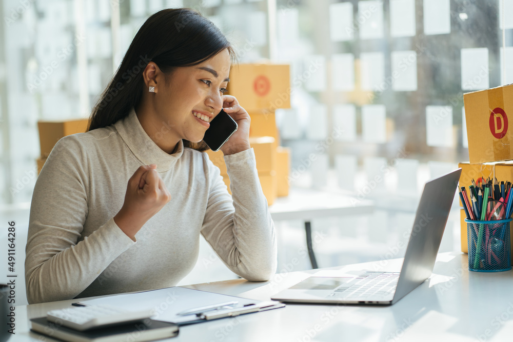 Portrait young attractive asia female owner startup business look at camera work happy with box at home prepare parcel delivery in sme supply chain, procurement, omnichannel commerce online concept.