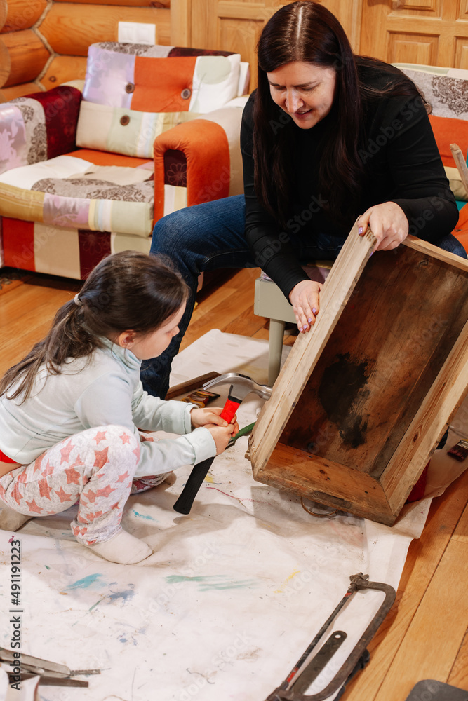 Little girl with hammer in hands fixing old wooden box and mother holding box firmly in workshop for renovation. Giving old things new life. Reuse of aged. Sustainable actions for helping planet.