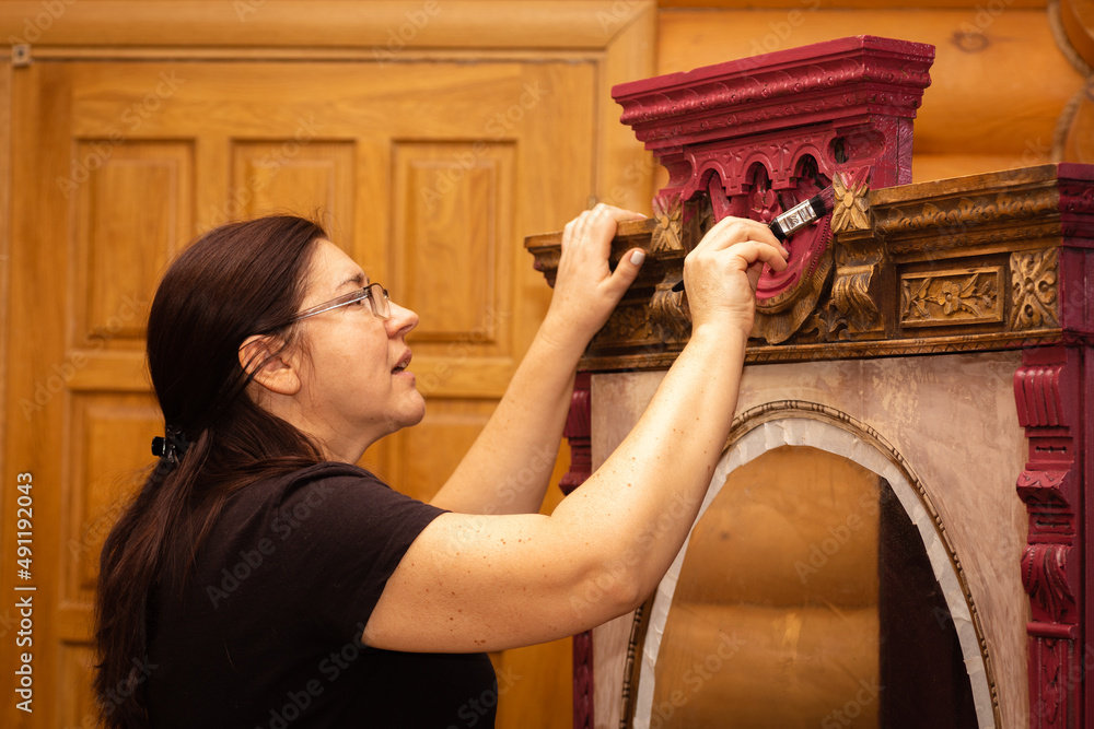 Coloring upper part of ornaments on shabby wooden cupboard in red color with big brush performed by engaged woman. Reuse of old. Workshop for old antique furniture restoration at home. Eco-friendly.
