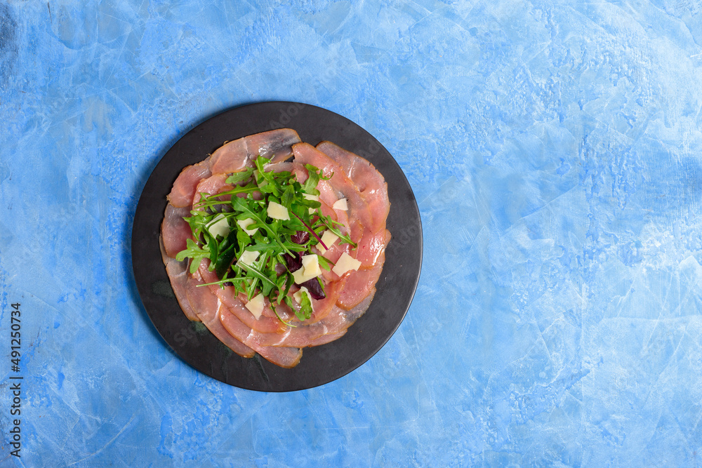 Beef or smoked turkey carpaccio with mixed salad and parmesan. On a blue background, top view, space for text