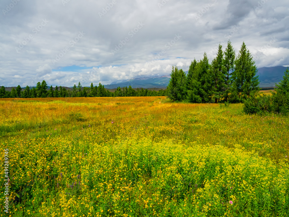 Mountain alpine woodland. Spring atmospheric green forest landscape. Alpine calm landscape of a blooming spring field with cedars.