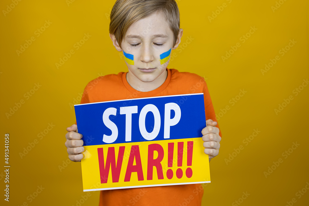 a boy with a painted flag of Ukraine on his cheeks closed his eyes and holds a poster with the inscription stop war