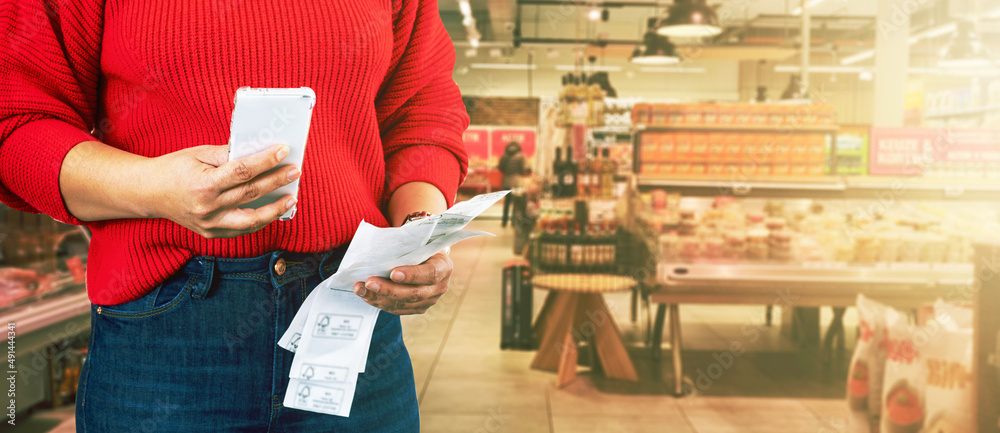 A woman checking grocery cost using calculator in smartphone compare prices with receipts from previous month in supermarket. Rising grocery prices and surging cost as an inflation financial crisis.