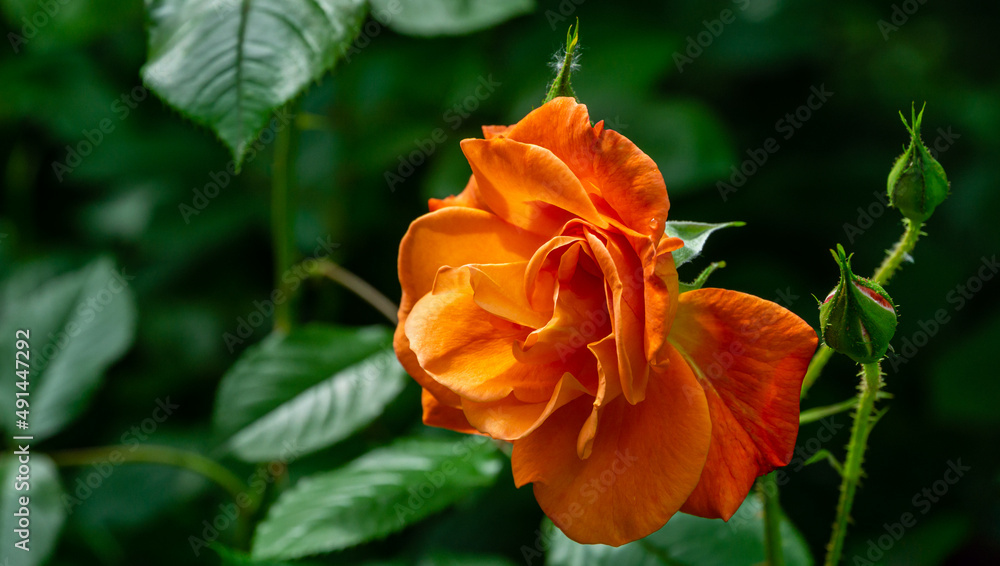 Close-up bright orange beautiful rose Westerland with green leaves background against sunlight. Lyric motif for design. Flower rose landscape, fresh wallpaper, nature background concept