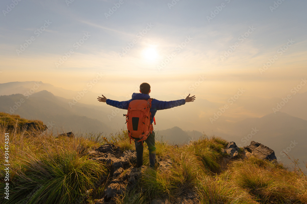 Portrait of Asian man, a tourist or backpacker, travel on green mountain hills with fog on holiday vacation. Nature landscape background, Thailand. People lifestyle.