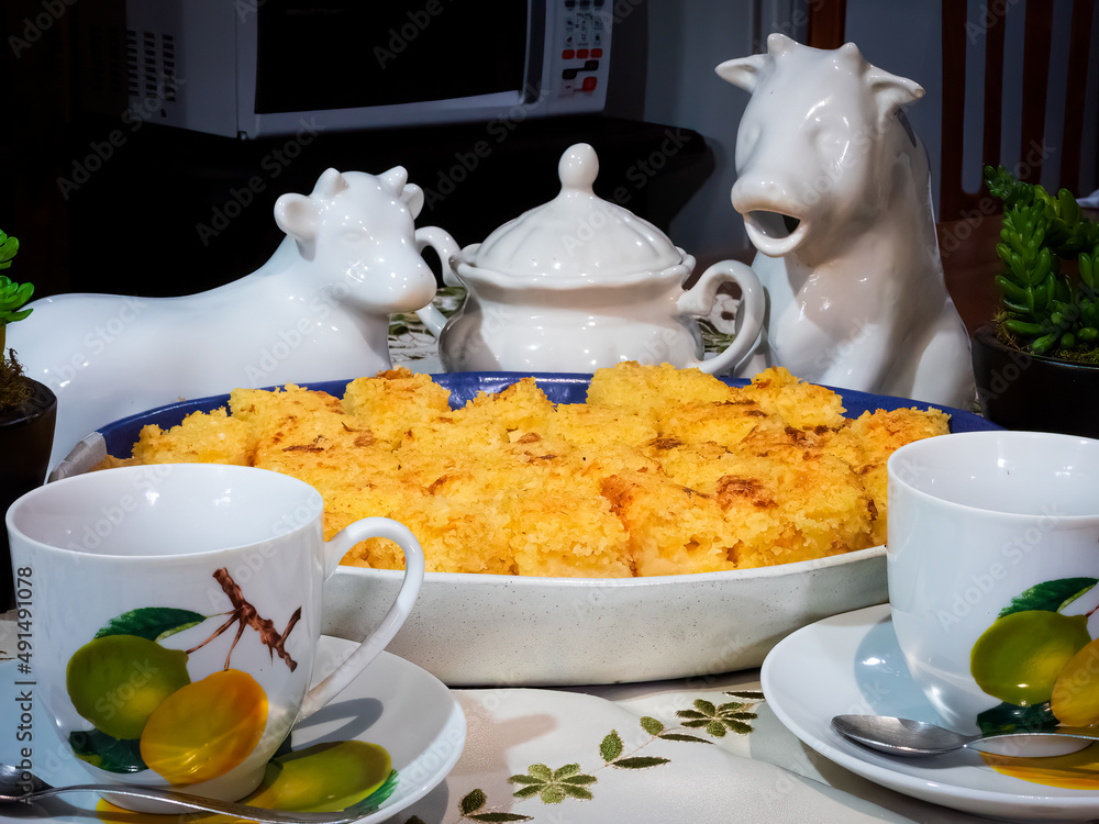 Pieces of cake on a serving bowl, white teapot and butter dish in the shape of a cow, two white tea cups with lemmon painting on a table with green floral embroidery . Microwave behind, kitchen.