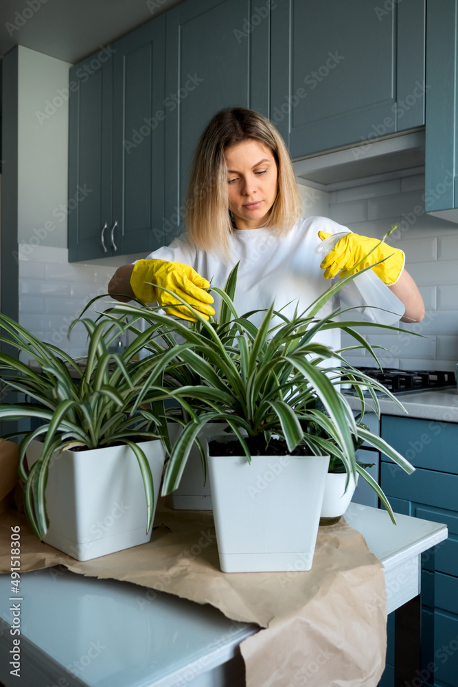 Woman gardening takes care house plants at kitchen