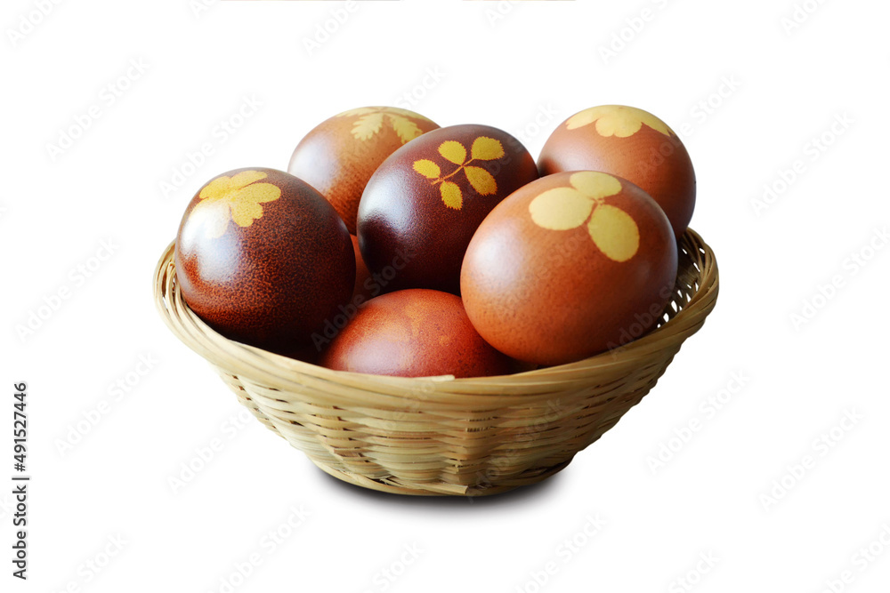 Easter eggs in basket. Naturally dyed eggs with onion skins isolated on white background.