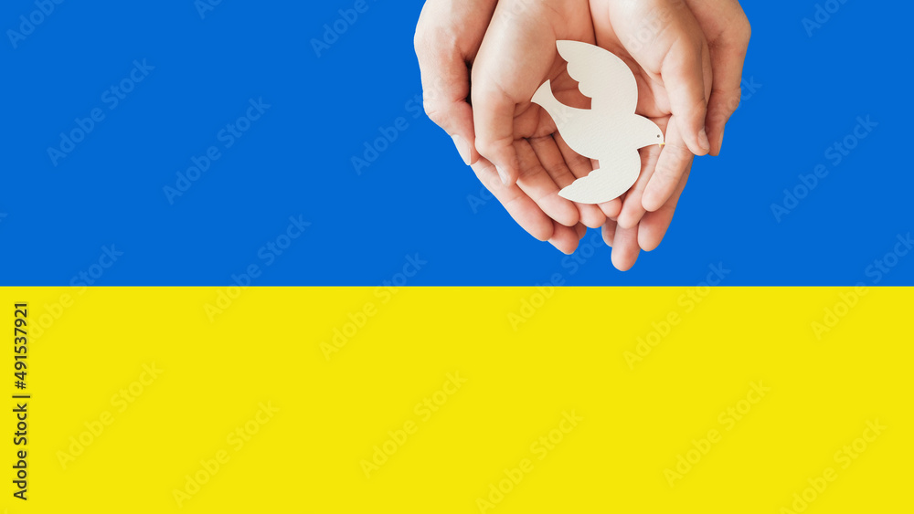 hands holding white dove bird on blue and yellow background. Pray Peace for UKraine