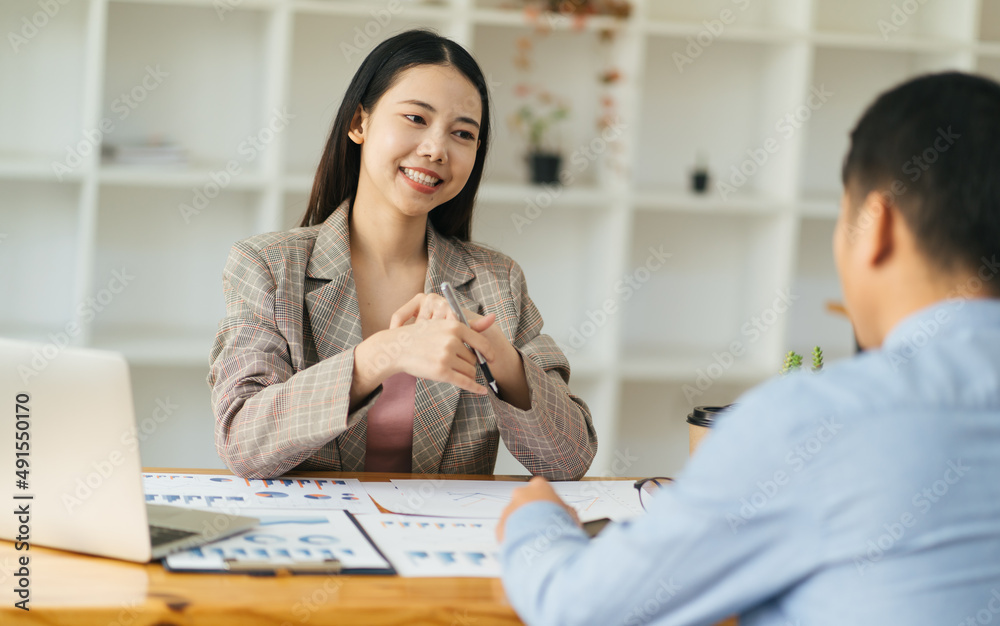 Skilled female leader of marketing experts working group explaining successful strategy for startup project to attract followers to online web store while having meeting with colleagues in cafe
