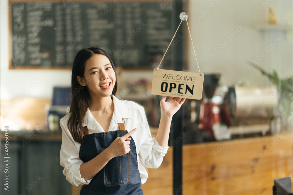 Asian Happy business woman is a waitress in an apron, the owner of the cafe stands at the door with a sign Open waiting for customers. Small business concept, cafes, and restaurants