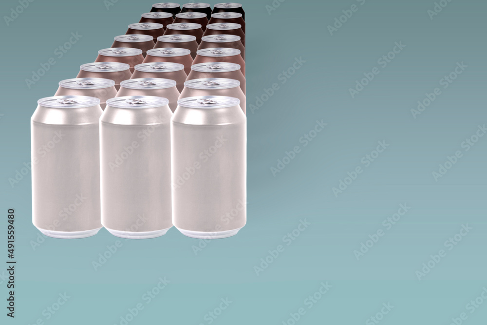 Bright aluminum cans forming a brown gradient on a sky blue background. Concept color tones