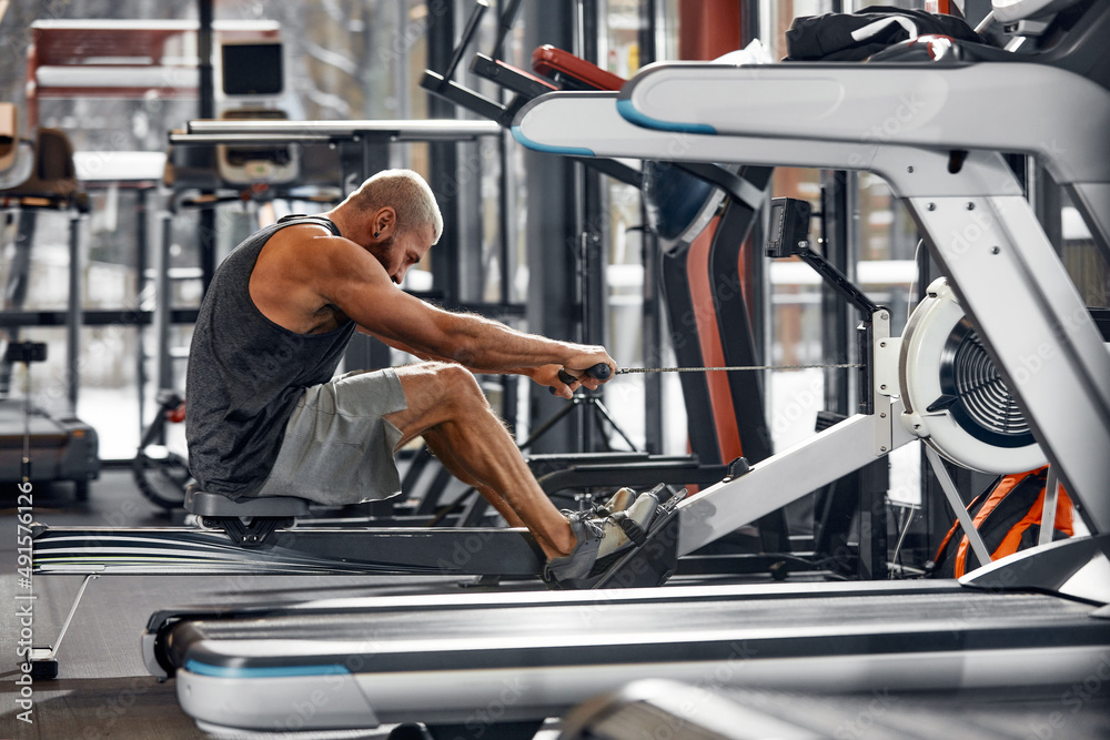 Training legs in the simulator, the athlete works with his legs on the simulator, working out the muscles on the legs