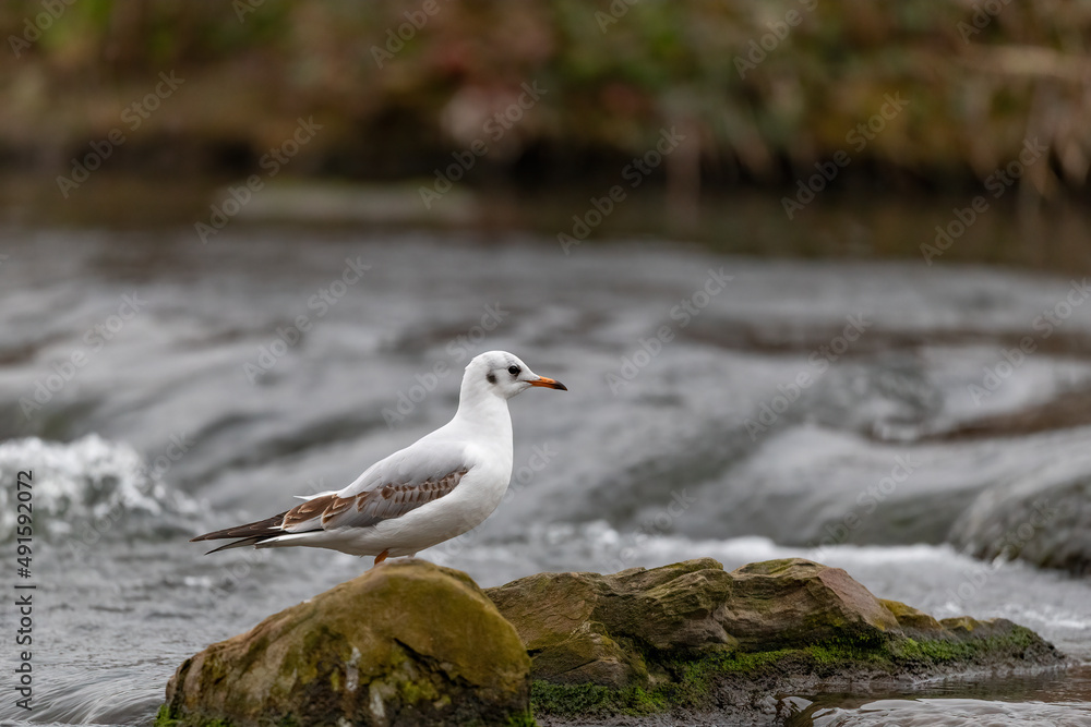 Eine Lachmöwe sitzt auf einem Stein im Flusslauf