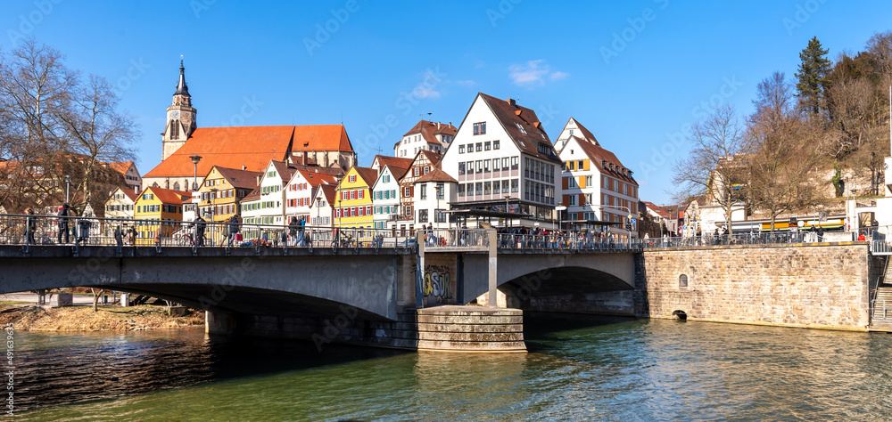 View of the Neckar and the idyllic city of Tübingen on a sunny day in spring , Black Forest, Germany-1