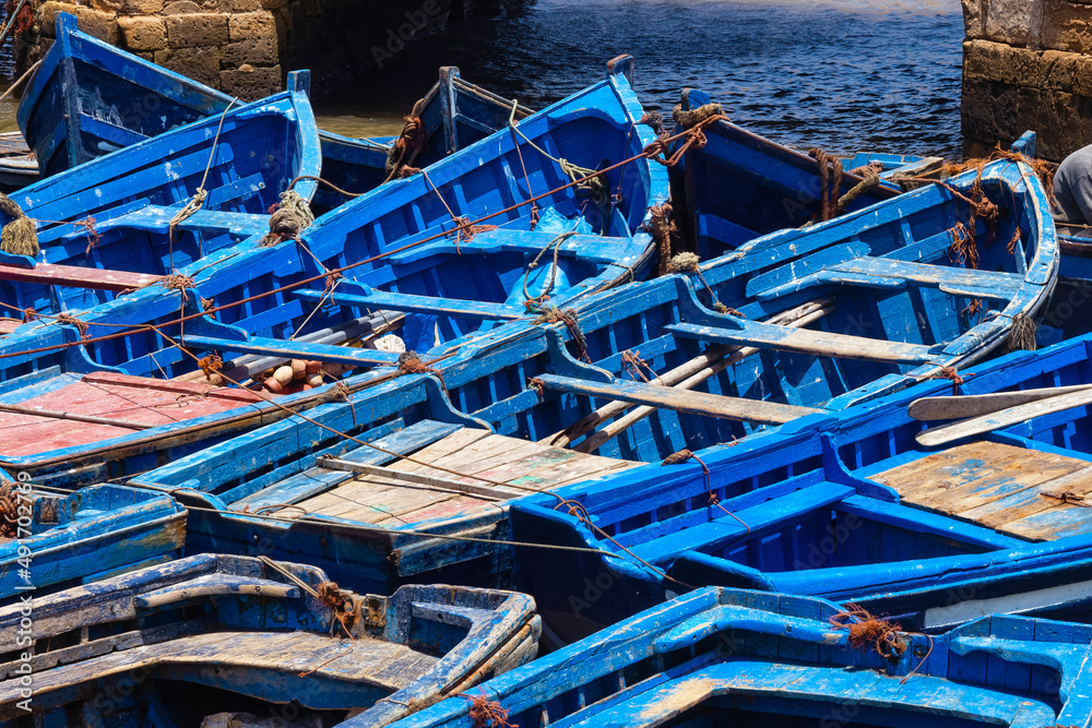 Famous fishing wooden blue boats of the Essaouira. Morocco.