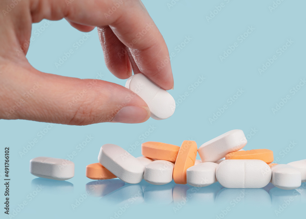 Medical background. Hand holds one of many capsule tablets or pills on blue table. Close up. Healthcare pharmacy and medicine concept with copy space Painkillers or prescription drugs consumption