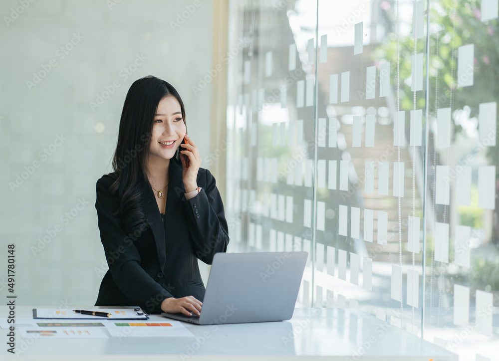Informal Call. Happy young asian woman calling her friend, talking and asking about something, using laptop.