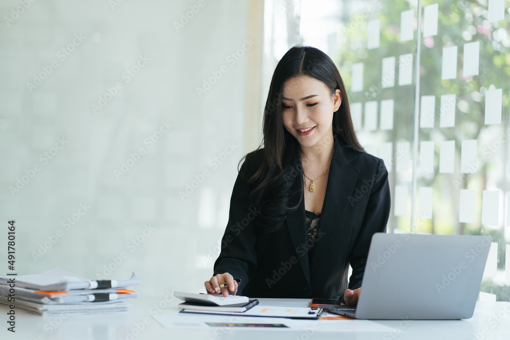 Smiling young asian businesswoman taking notes while sitting with laptop computer over white background
