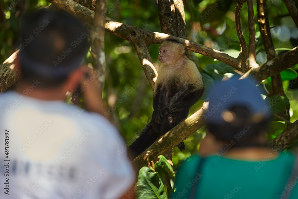 Photographers, monkey disturb in the forest. White-headed Capuchin, black monkey sitting on tree branch in the dark tropical forest. Wildlife of Costa Rica. Travel holiday in Central America.